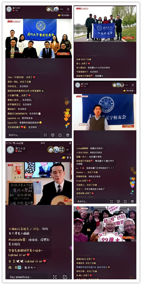 虽然不能当面相聚,但师生校友对母校的情谊丝毫没有消减。当天的建南大会堂,座椅上摆满了师生校友的祝福牌,随着庆祝大会的进行,广大师生、校友在央视频、抖音、快手、B站、视友网等多个直播平台上表达着对母校浓浓的爱。“我厦生日快乐”“我心永属厦大”“庆九九华诞,期百年荣耀”“九九治学路,久久厦大情”“战‘疫’必胜”……一系列祝福语持续刷屏,将大会氛围不断推向高潮。