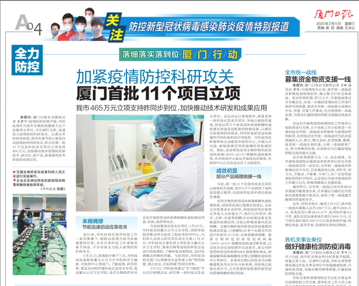 本报讯(厦门日报社全媒体记者 吴君宁)疫情防控形势严峻,市科技局作为我市生物医药健康千亿产业链牵头单位,当先锋打头阵,迅速投入疫情防控科研攻关。记者从市科技局获悉,我市在春节前已紧急启动疫情防控科研攻关,昨日对第一批11个应急科技攻关项目立项支持465万元,加快推动我市疫情防控新技术、新方法、新产品、新装备的技术研发和成果应用。