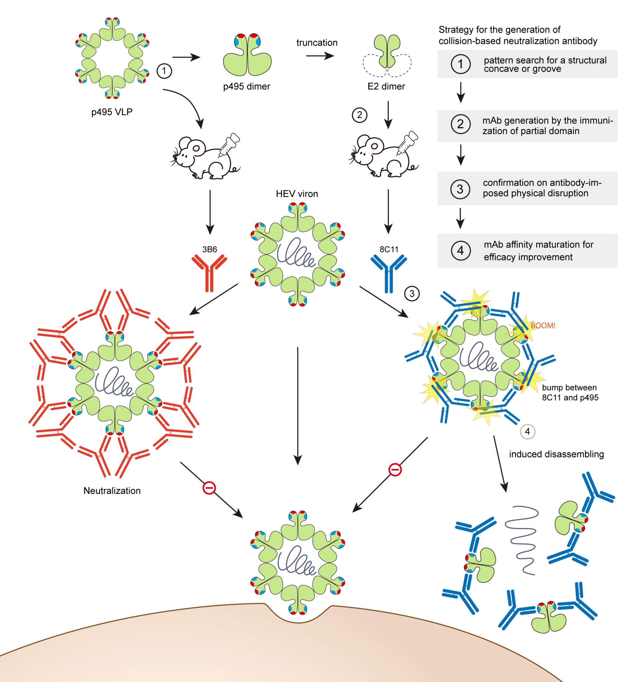 中和抗体是机体抵御病毒入侵的一类免疫球蛋白,也是疫苗发挥作用的主要效应分子。目前已知的中和抗体作用机制,主要包括阻断病毒-细胞相互作用和介导免疫调理作用。最近我校夏宁邵教授团队研究结果揭示了一种由抗体诱导病毒原位崩解的中和新机制。