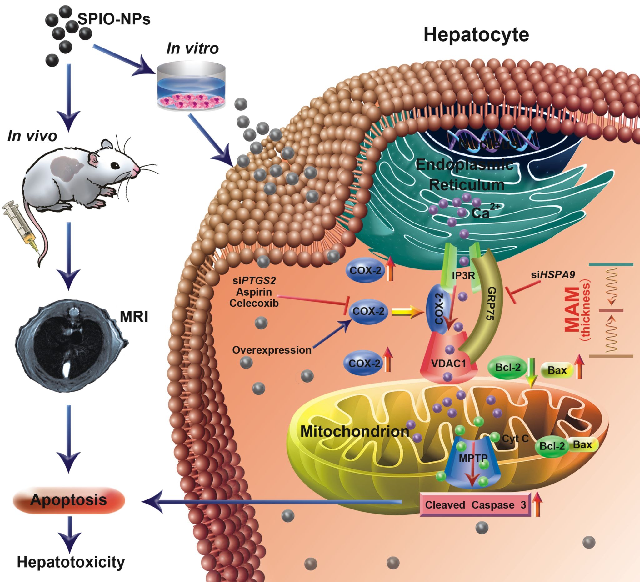 该团队研究发现,体内、外试验阐明SPIO-NPs急性暴露可以诱导肝细胞株和小鼠肝组织细胞中COX-2表达、MAM蛋白组分和结构改变、以及细胞凋亡的发生;诱导的COX-2可定位在MAM上,与IP3R-GRP75-VDAC1复合物发生相互作用,参与MAM结构组成和Ca2+转运功能,调节SPIO-NPs诱导的肝细胞线粒体依赖性凋亡转归和肝损伤;COX-2的靶向干预可抑制SPIO-NPs暴露诱导的肝细胞中MAM结构和功能变化介导的肝毒性效应。本研究结果可为SPIO-NPs在生物医药领域应用的安全性评价提供线索,为探讨MAM组成结构和功能评价应用于外源物暴露诱导的肝细胞毒性和肝损伤的预防和控制提供理论依据。