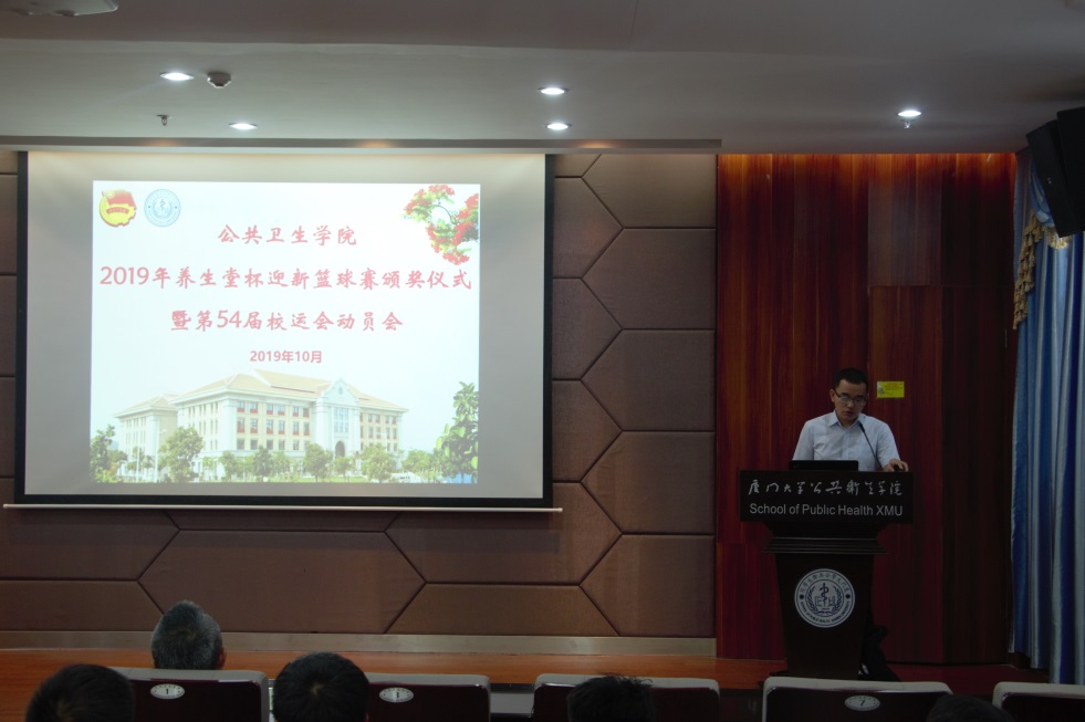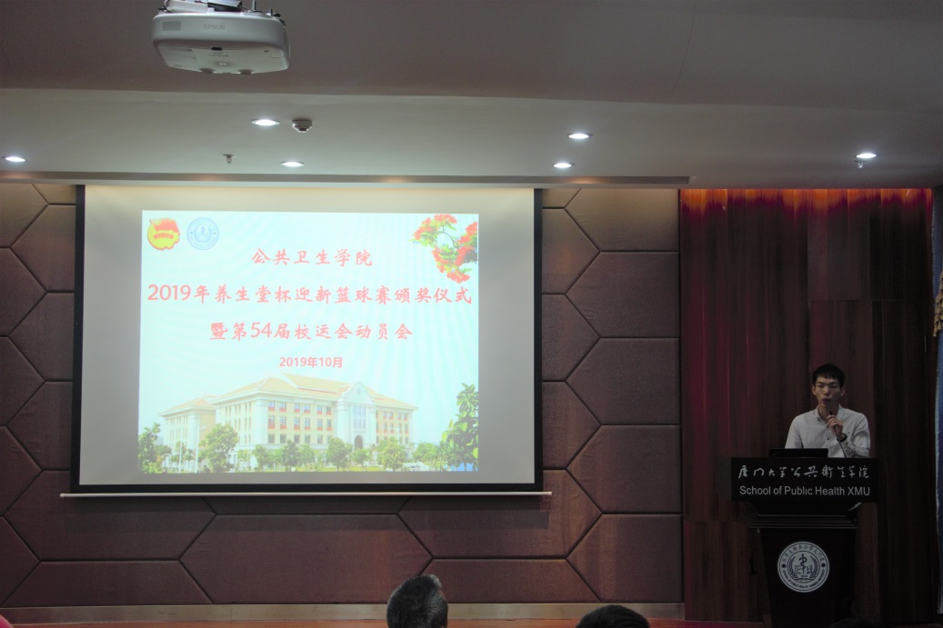 10月31日中午,第三届“养生堂”杯迎新篮球赛颁奖仪式、第53届校运会优秀运动员表彰大会暨第54届校运会动员大会在曾宪梓楼101报告厅举行,学院党委副书记黄兆君、杨机像,辅导员赵煜,各参赛篮球队,第53届校运会优秀运动员及第54届校运会全体运动员参会。会议由学院团委副书记沈鑫主持。