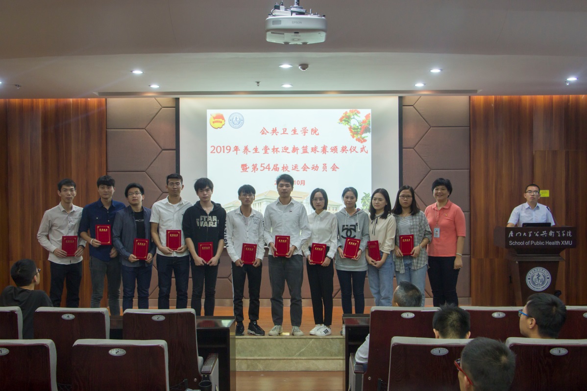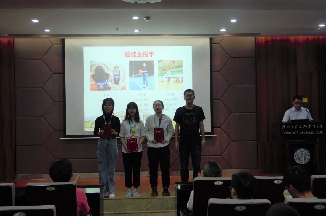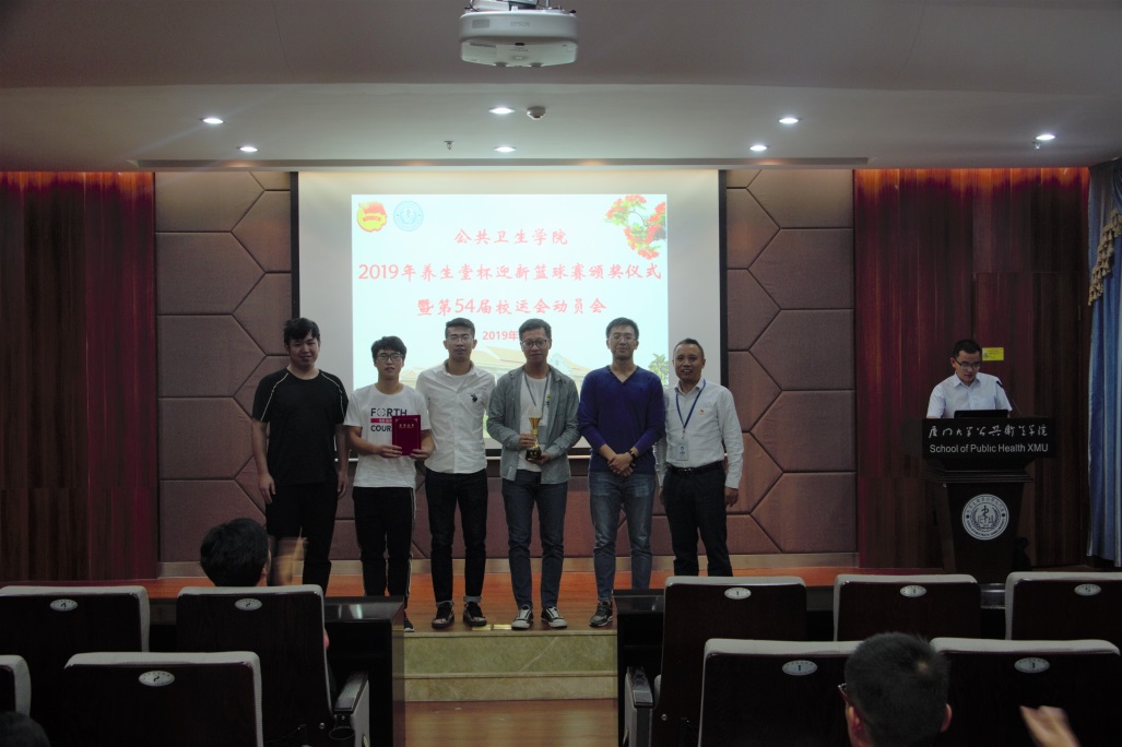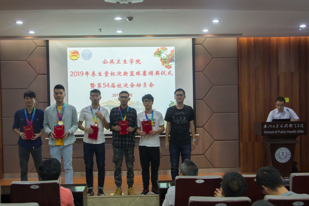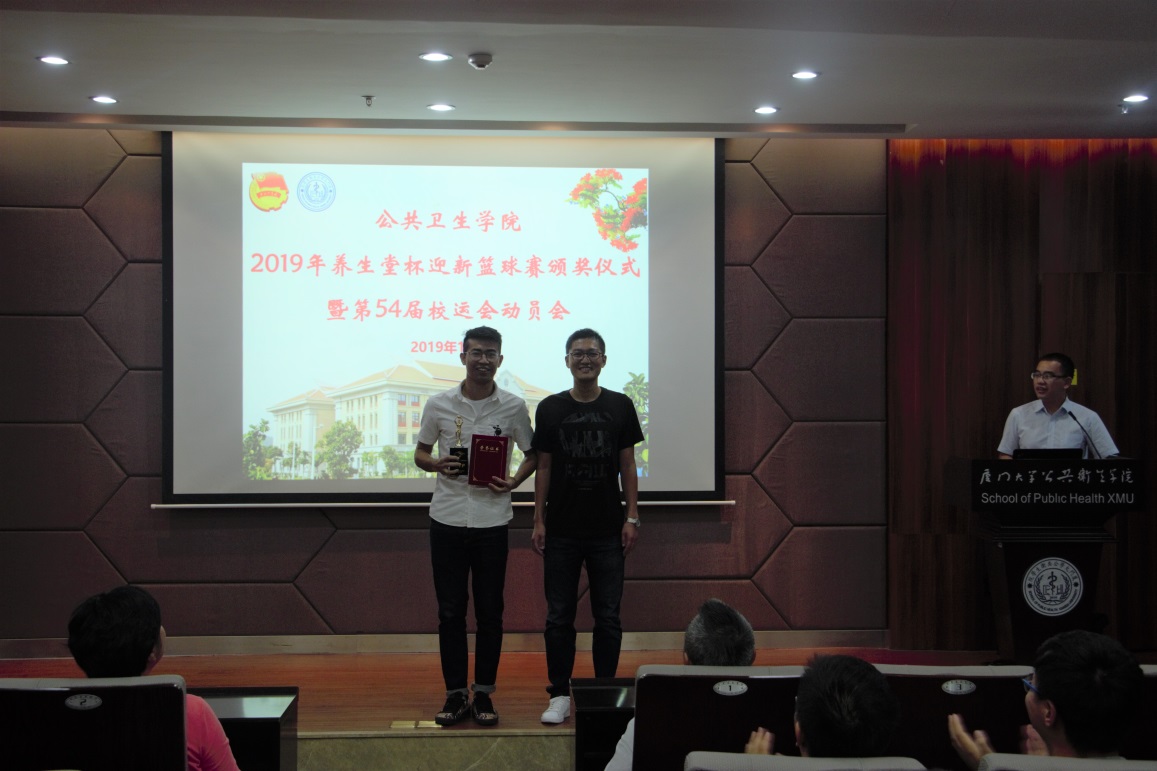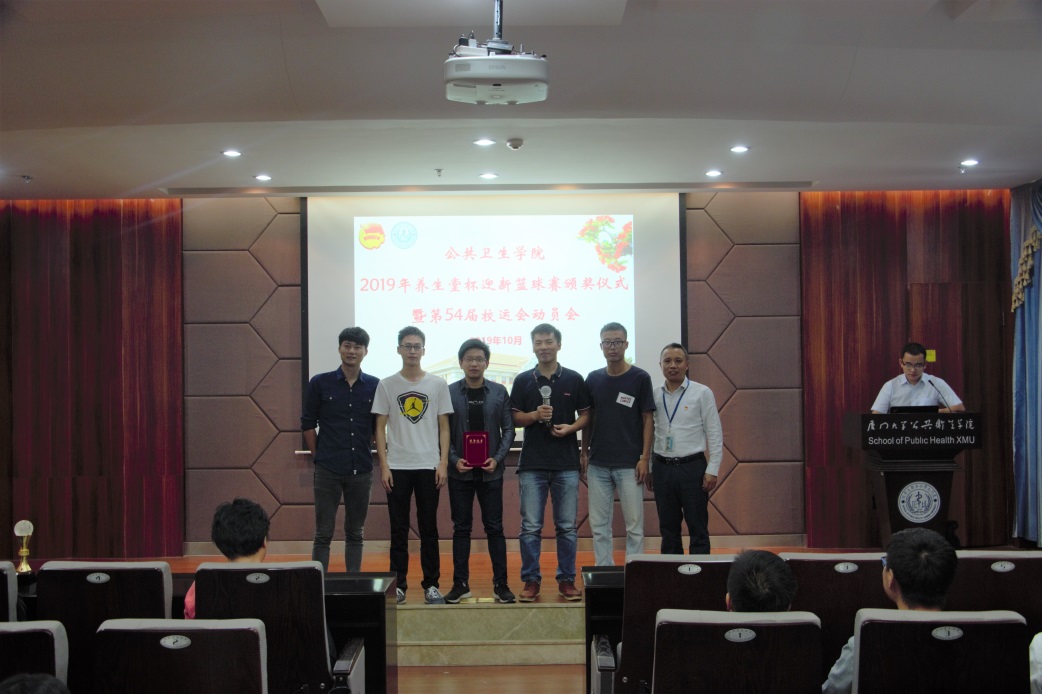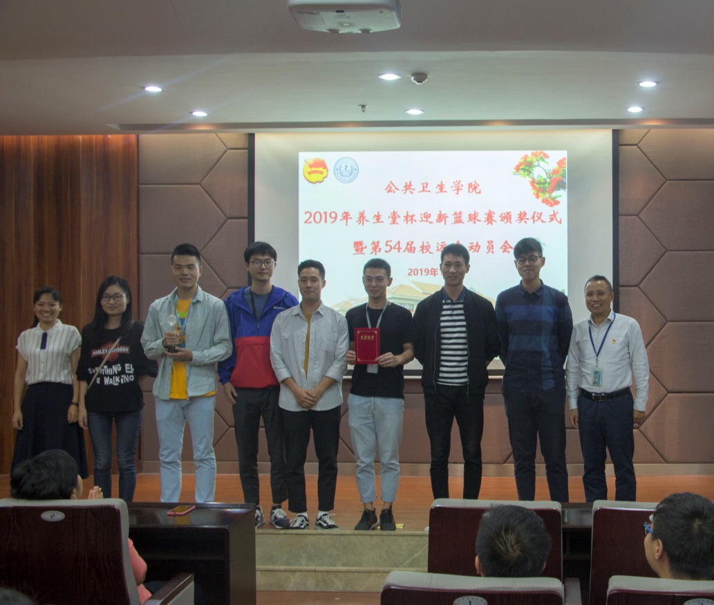 首先,举行第三届“养生堂”杯迎新篮球赛颁奖仪式。党委副书记杨机像老师为本次篮球赛的冠、亚、季军颁奖,获得冠军的队伍是2017级研究生队,亚军队伍是2018级研究生队,季军队伍是公卫交流生队。随后,赵煜老师为比赛过程中表现优异的同学颁发个人奖项,获得最佳阵容奖的是2018级本科生阿尔心·艾力、2018级博士生罗国兴、2017级硕士生何斌、2017级硕士生孙辉及生科2019级硕士生张思博;获得最佳女投手奖的是2019级硕士生母丹、2017级硕士生余小娟和2018级本科生曾文雯;获得本次赛事最有价值球员的是2017级硕士生孙辉。