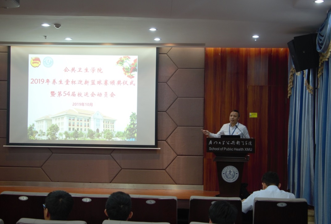 最后,学院党委副书记杨机像老师作动员讲话。杨老师表扬了参加篮球赛和运动会的每支队伍或个人,他们的精彩表现展现了公卫学子奋勇争先的优良精神风貌;同时,在第54届校运会来临之际,希望全体运动员团结协作、勇于挑战、奋力拼搏,争取取得优异成绩。