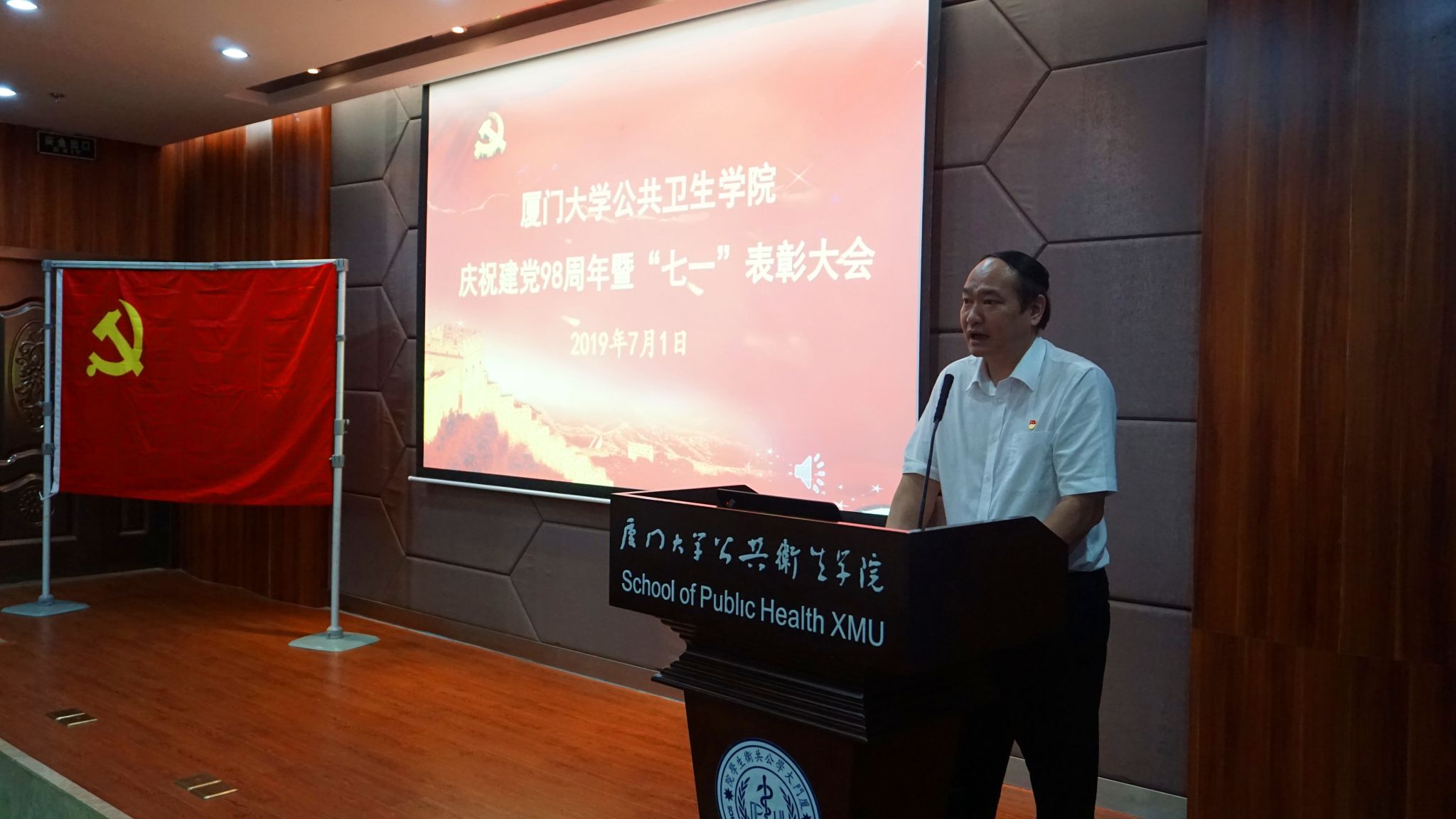 表彰大会在全场党员嘹亮的国歌歌声中开始。杨机像副书记代表院党委宣读表彰决定,教工第二党支部和研究生第六党支部获“先进党支部”,葛胜祥等11人获“优秀优秀党员”,曾雁冰等6人获“优秀党务工作者”,研究生第二党支部《深化“三红”教育,传承红色精神》、研究生第五党支部《预见未来——爱在大嶝,健康随行》获支部工作“立项活动”优秀成果。