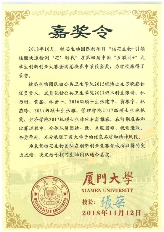 核芯生物团队自3月份组建以来,一路通过校赛、省赛的重重考验进入第四届中国“互联网+”大学生创新创业大赛。在前期准备与比赛过程中,全体队员团结一致、克服困难、锐意进取、奋勇争先,从全国64万个项目团队中脱颖而出斩获金奖,充分展现了厦大学子的优良品质和精神风貌。