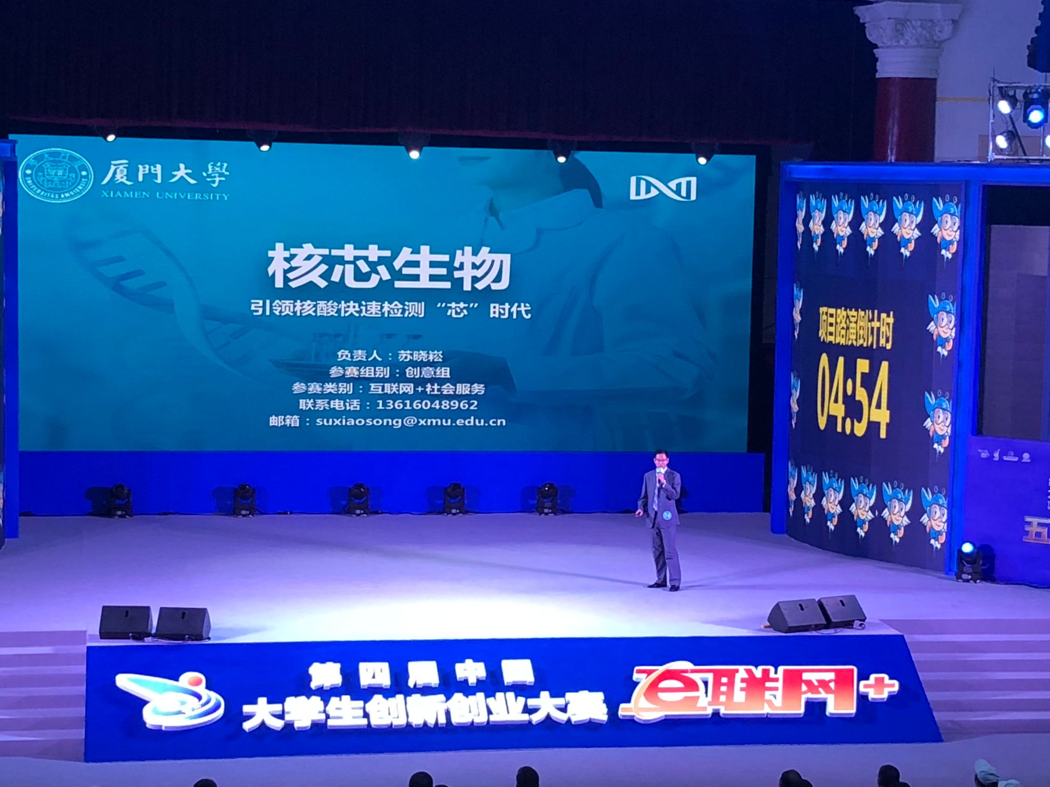10月13日-15日,为期三天的第四届中国“互联网 +”大学生创新创业大赛总决赛在厦门大学思明校区隆重举行。金沙集团1862cc“核芯生物”团队斩获大赛金奖,创造了金沙集团1862cc在大学生创新创业竞赛中的最好成绩。本次大赛共有64万支团队参加比赛,进入金奖争夺赛的共有290支,其中包含中国大陆(150支)和台港澳(20支)参赛队170支,“青年红色筑梦之旅”赛道60支,国际赛道参赛队60支。