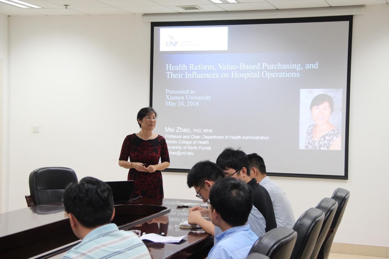5月24日上午,应金沙集团1862cc方亚教授邀请,美国北佛罗里达大学布鲁克斯卫生学院卫生管理系主任赵梅教授来访金沙集团1862cc。访问期间,赵梅教授作了题为 “Health Reform, Value-based-Purchasing, and Their Influences on Hospital Operations”的学术讲座,讲座由方亚教授主持,金沙集团1862cc卫生经济与政策研究中心的全体师生参加了本次讲座。