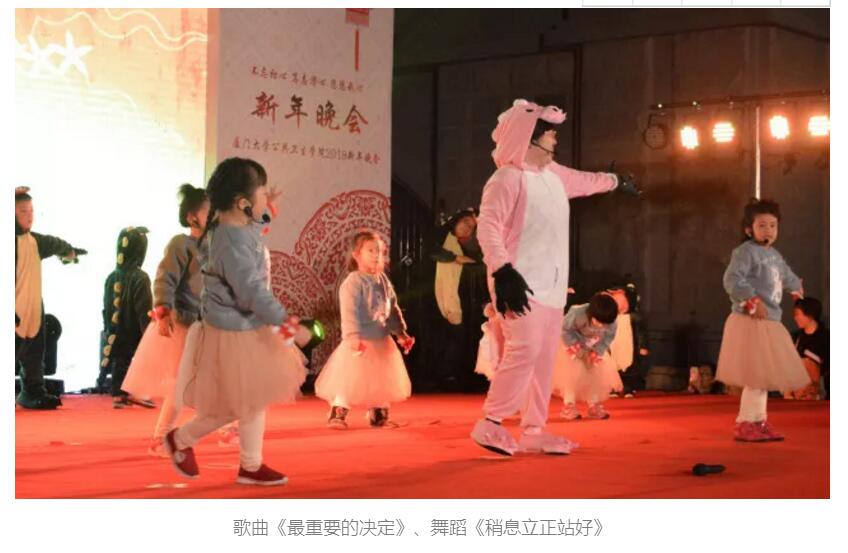 随后开始晚会文艺表演的第一个篇章“不忘初心”。展现青春活力的《啦啦操》、轻快灵动的拉丁舞蹈及歌曲《Rather be》、欢快鲜活的韩式舞蹈《As if it’s your last》、典雅优美的民族舞《锦鲤抄》带动了全场欢快活泼的气氛。紧接着,来自江宜珍老师、安然老师和小朋友们热情表演的《最重要的决定》、《稍息立正站好》,令人仿佛回到无忧无虑的童年时代。庄思洁老师一曲独唱《爱在天地间》,歌声深情曼妙,带领大家一起感受艺术与爱的魅力。
