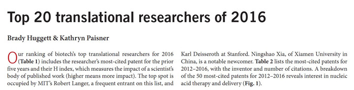 《自然•生物技术》(Nature Biotechnology)12月9日公布的2016年度全球转化研究人员前二十榜单上,首次出现两位中国大陆地区学者,他们是我校分子疫苗学和分子诊断学国家重点实验室、国家传染病诊断试剂与疫苗工程技术研究中心夏宁邵教授和李少伟教授,分别列第七和第十二位,体现了我校在国际生物技术领域的影响力正在快速提升。