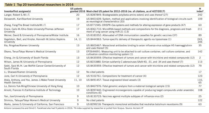 2013年至今,《自然•生物技术》每年年底公布前一年度全球转化研究排名前20名的研究人员,在全球范围内产生了广泛影响。该榜单优先基于候选人前一年度的美国和欧洲授权发明专利数量从高到低进行排名,再综合最高被引的发明专利引用情况、候选人H-index指数等指标进行最终排名。历年入选者中,不乏大家熟知的科学家,如诺贝尔奖得主David Baltimore、Broad研究所的张锋(Feng Zhang)博士。