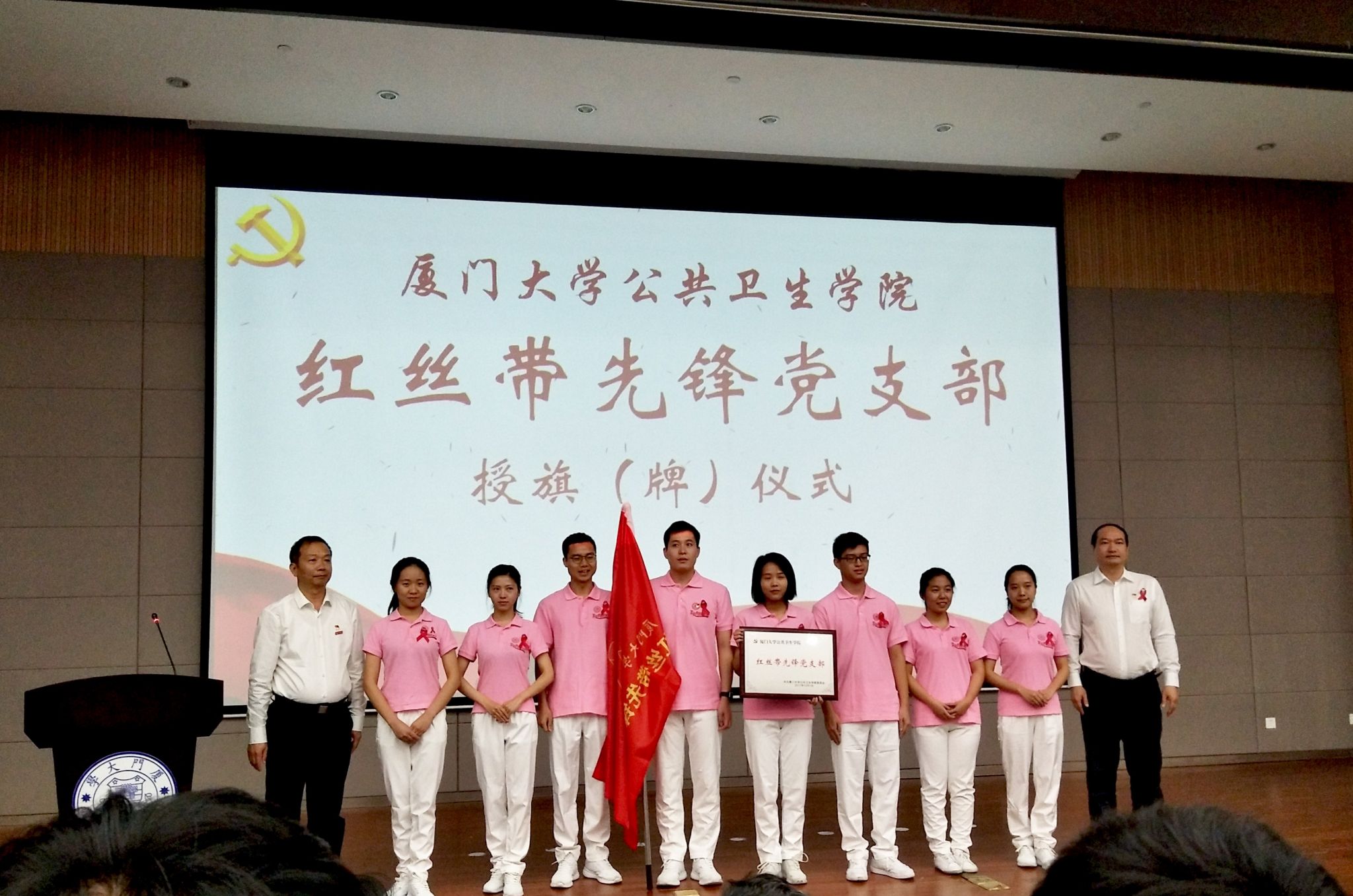 活动举行了金沙集团1862cc成色“红丝带先锋党支部”授旗(牌)仪式。张琥宣读党支部成立决定。他说,成立红丝带先锋党支部,旨在积极响应党的十九大报告中提出的“实施健康中国战略”,发挥学院专业优势,让青年党员成为防治艾滋病宣传活动的倡导者与实践者,共担防艾责任,共享健康权利,共建健康中国,做防艾抗艾宣传活动的先锋队和排头兵。在雄壮的乐曲声中,陈光郑重为先锋党支部授旗,张琥为先锋党支部授牌。