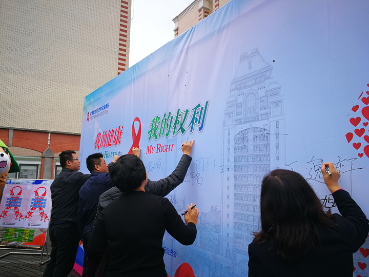 在三家村学生广场,“我的健康,我的权利”签名及知识问答活动火热进行着。该活动主要通过给陌生人一个拥抱,发放宣传资料,在签名板上签名以及有奖知识竞答等方式宣传并普及防艾知识。活动面向大学生和社区居民,希望大家都加入到关注艾滋的队伍中来。同时,来自厦大医院的医生们也身穿白大褂现场坐诊,为大家进行健康咨询。可爱的“易班熊”和“大白”也佩戴着红丝带参与到活动中,和参与者热烈交流。