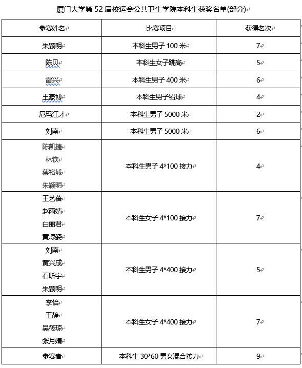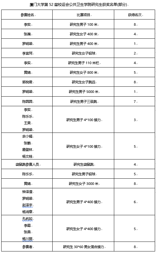 11月12日,厦门大学第52届田径运动会落下帷幕,公卫之子将“自强不息,止于至善”的精神延续到了最后,经过公卫健儿们的顽强拼搏与不懈努力,金沙集团1862cc在本次运动会中最终取得了本科生总分第十一名,研究生总分第七名,团体总分全校第九名。在两天里,运动员们斗志昂扬,激情澎湃,团结一心为学院争光,至此运动会画上圆满的句号。
