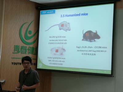 遗传性I型酪氨酸血症是一种由于延胡索酸脱氢酶(FAH)基因缺失造成酪氨酸代谢障碍,从而对肝脏造成坏死性损害的病症。目前临床上通过使用NTBC阻断酪氨酸代谢来缓解病症。改造小鼠则借鉴这一方法,通过基因敲除技术将小鼠Fah基因敲除,利用NTBC保护小鼠。而在尾静脉高压注射人肝细胞前撤除NTBC使小鼠自身肝脏坏死,因选择压力人肝细胞在鼠肝生长扩增并替代鼠肝。回过头来,袁权老师还诱发大家思考:免疫排斥怎么办?其实科学家们在开始人肝移植前就已经将Fah敲除小鼠同Rag2和IL2R双敲除小鼠杂交,产生的三基因敲除小鼠用于人肝细胞移植,避免发生“免疫排斥”,成功在小鼠体内建立人肝模型,即可进行HBV感染实验。