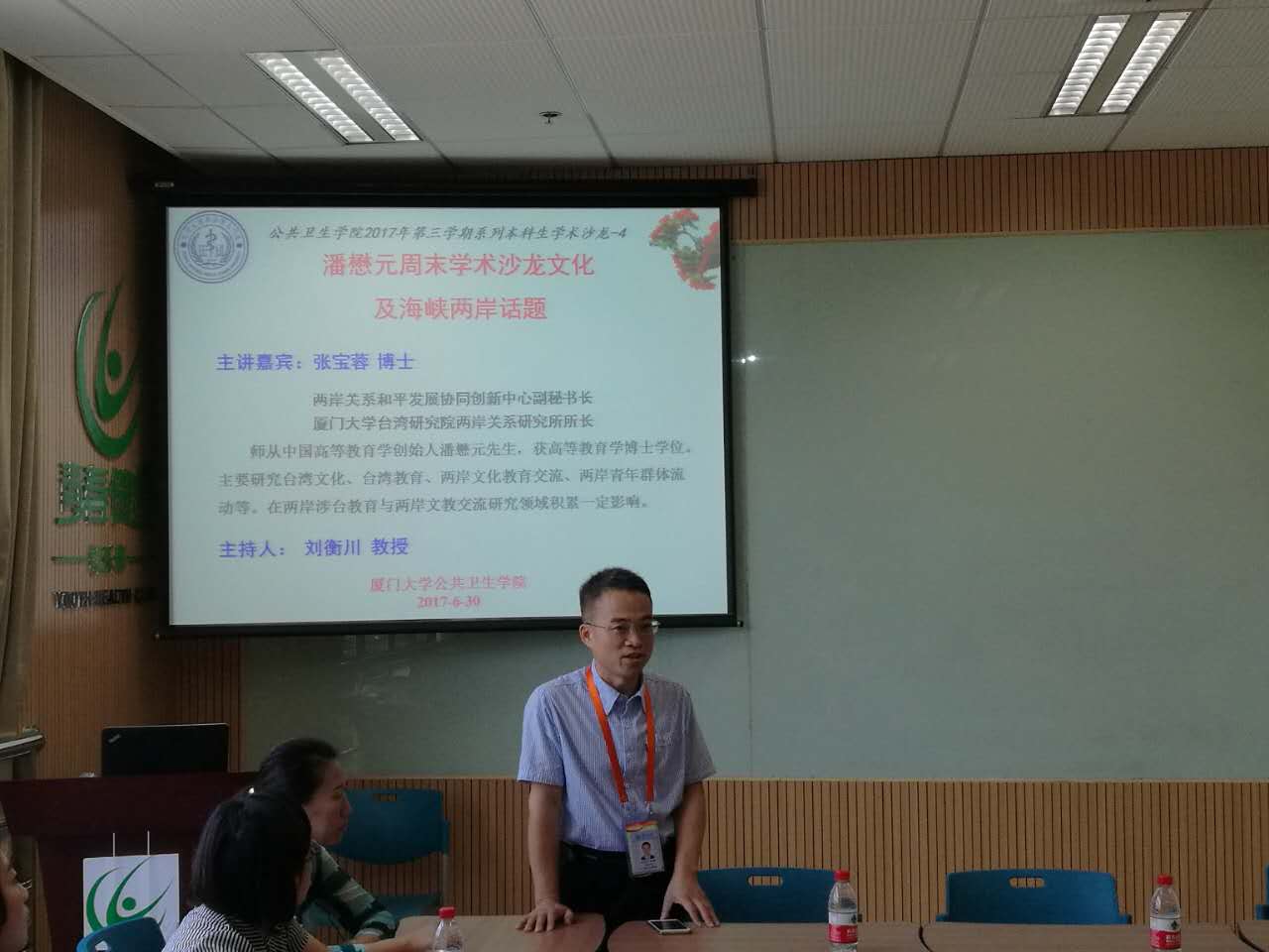 经过前三次反响喜人的学术沙龙后,6月30日迎来了第四次学术沙龙活动。本次特邀沙龙嘉宾为两岸关系和平发展协同创新中心副秘书长、厦门大学台湾研究院两岸关系研究所所长张宝蓉老师,分享“潘懋元周末学术沙龙文化及海峡两岸话题”。沙龙由副院长林忠宁教授主持,参加人员是:2013级预防医学24名本科生以及预防医学系刘衡川、范春、林育纯、江宜珍、赵苒、何承勇老师。