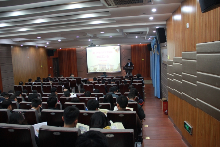 首先,院长夏宁邵分析了学院和学科发展的背景与环境,回顾总结并分析了2016年度学院在教学、科研、平台建设、人事改革、合作交流、文化建设等工作的成绩与不足,并分析学院总体发展状况,明确学科发展思路,部署了2017年的工作目标任务。他强调要立足于学院现有基础,放眼学科前沿和发展趋势,坚持“跳跳高,够得着”的理念,进一步在推进人才培养、教学、科研、人才引进等方面的探索与改革,争取每年都有新进步,从而不断提升学院的办学实力。