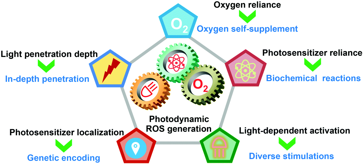 活性氧(ROS)介导的机制是光动力疗法(PDT)的主要作用机制。该过程是基于光、光敏剂(PS)和氧之间的级联协同作用。针对三种元素的设计调控,极大地利于实现肿瘤PDT疗法的时空控制。同时,传统PDT也催生出不同层次的局限性和技术挑战。