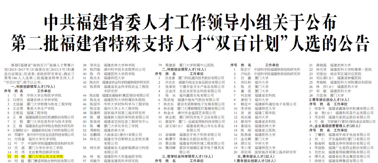 热烈祝贺刘刚教授入选第二批福建省特殊支持人才“双百计划”